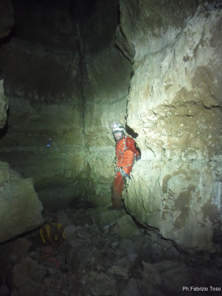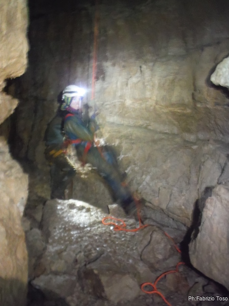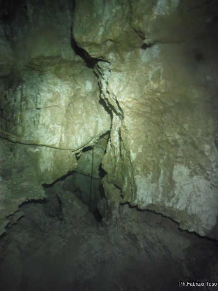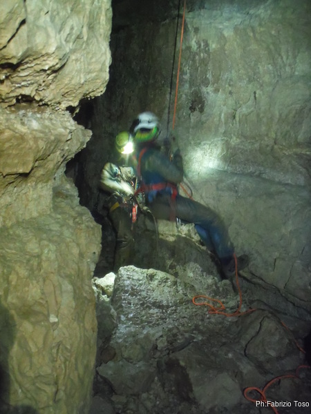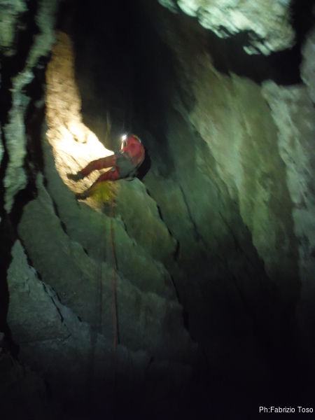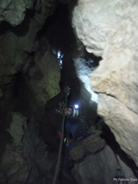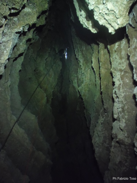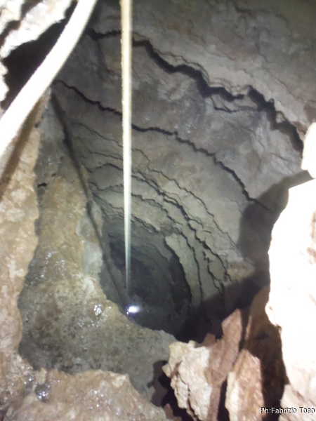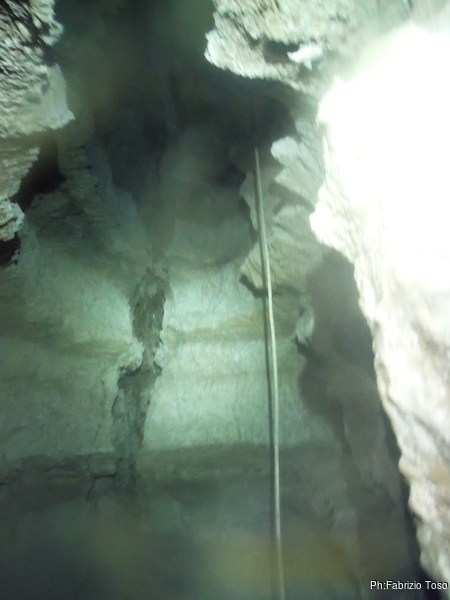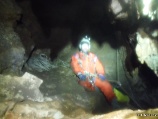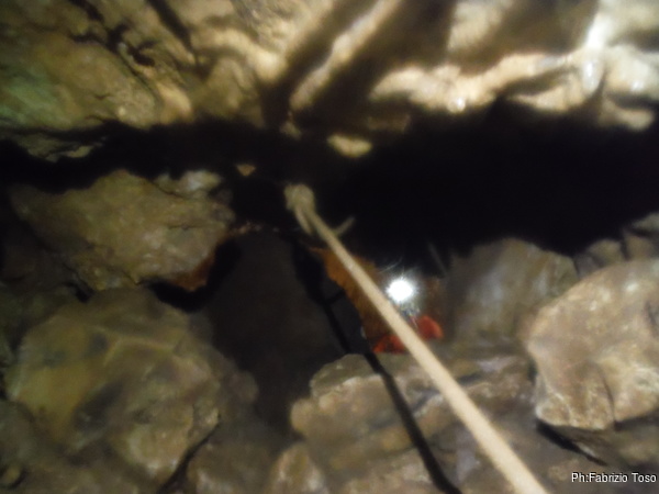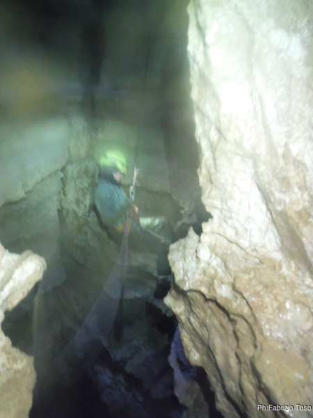 Lasciamo Giancarlo il tempo di partire per la sua discesa ed andiamo ad affrontare il pozzo successivo. La partenza e’ pochino stretta ma si passa facilmente. A meta’ c’e’ un frazionamento e quindi si arriva al fondo del pozzo.