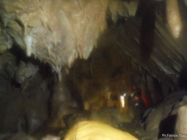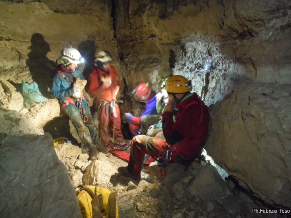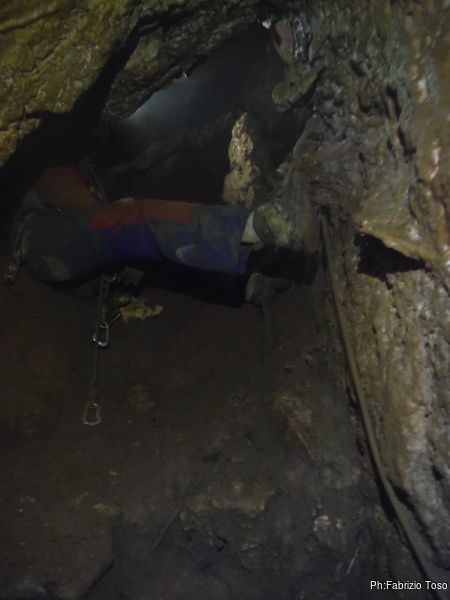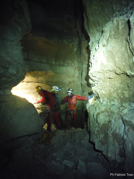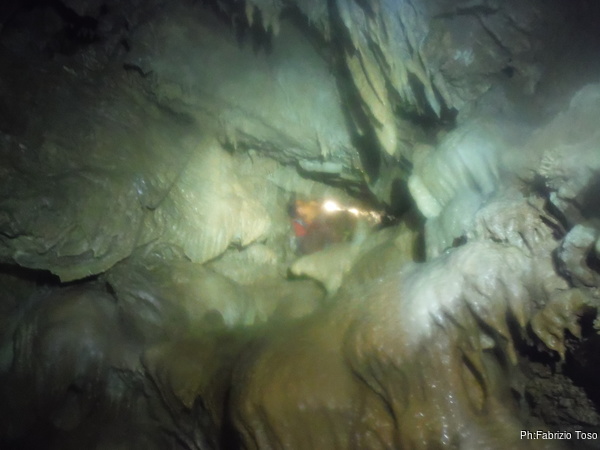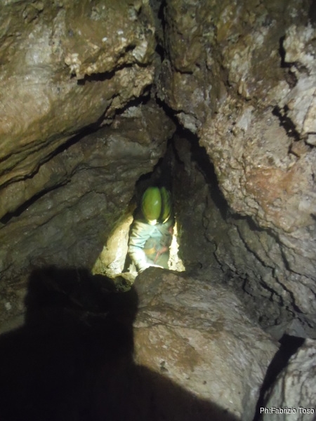 Alla base del pozzo aspetto che si riformi il gruppo poi ci inoltriamo insieme nel tratto di meandro, una decina di metri, che al momento costituisce il fondo di questo ramo. Dopo una breve sosta a commentare le possibili quanto improbabili prosecuzioni, prendiamo la via del ritorno.