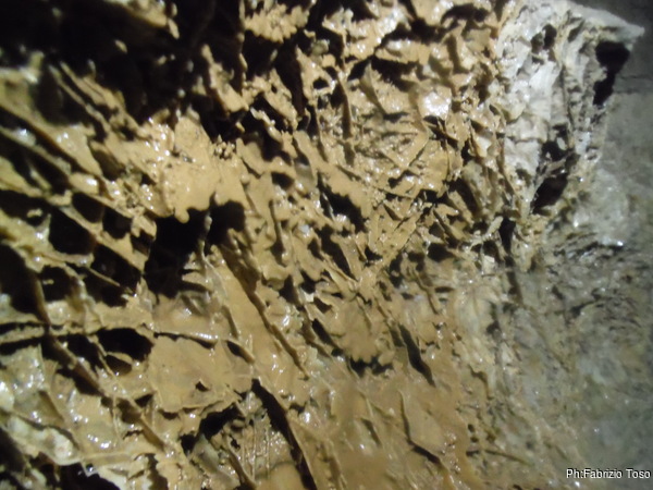 Ogni tanto qualche sassolino arriva, quindi ci sistemiamo ai 2 lati opposti della base del pozzo. Inganno l’attesa cercando, invano, di fotografare lo sbrilluccichio dei frammenti di mica incastonati nel fango.