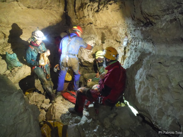 Sopra sentiamo alcune urla, ma non si capisce cosa stia succedendo. Per fortuna dopo un poco di paziente attesa si iniziano a vedere le luci degli ultimi due discensori.