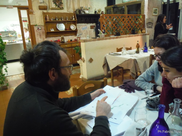 La nostra destinazione successiva puo’ essere una sola, il ristorante da Antonia a Marano Equo! Prima che arrivi la pasta, Gabriele fa fare un ripasso a tutti sulla grotta mostrandoci il disegno del rilievo stampato in formato “tovaglia”.