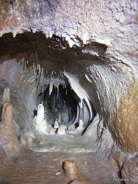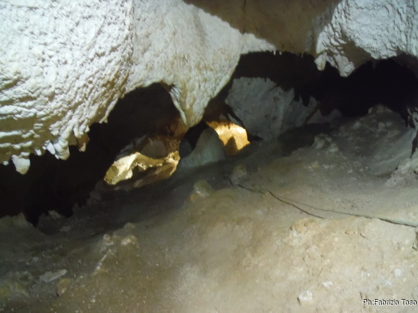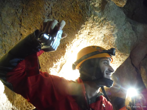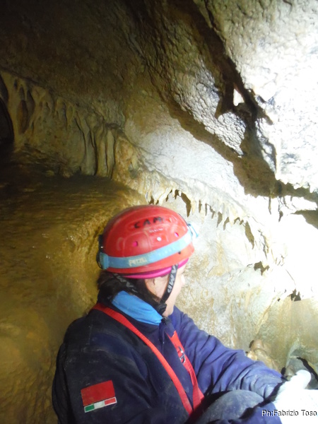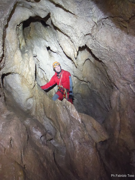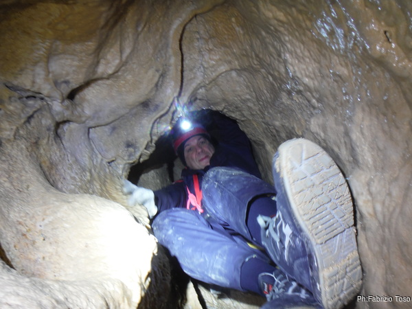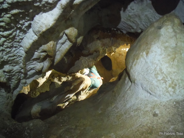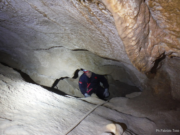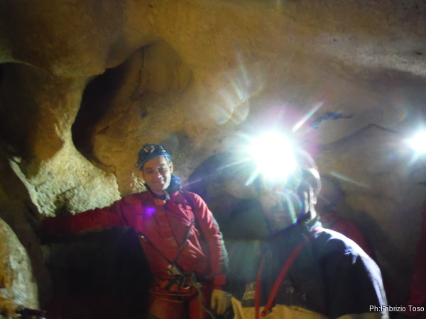 Il traverso che segue il pozzetto permette ai miei amici di familiarizzare con l’uso delle longe. Se la cavano egregiamente. Sono ancora impostato sul risparmio di foto quindi mi dimentico di riprenderli mentre traversano con perizia. Arriviamo in un baleno al primo toboga. Aspetto che il prode Giuseppe arrivi con la corda e la sistemo all’armo, stavolta pero’ monto la corda nel discensore dal verso giusto. Ancora una volta scendo giu’ lasciando a Giuseppe di calare i nostri amici. Una sosta al cunicoletto delle meraviglie la devo fare.