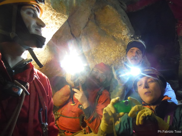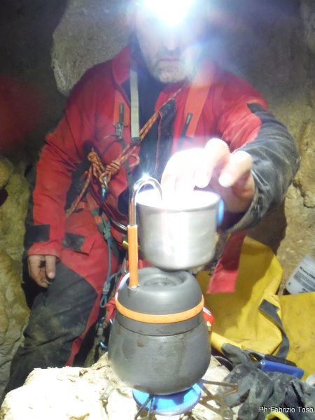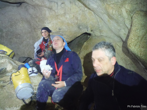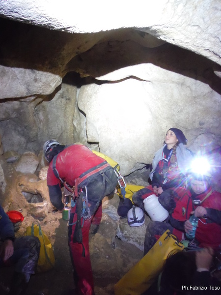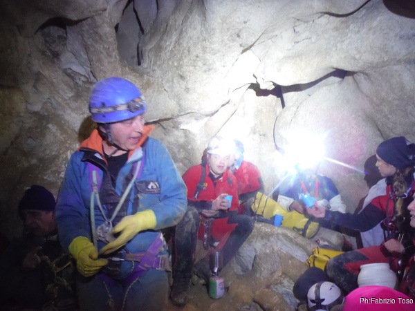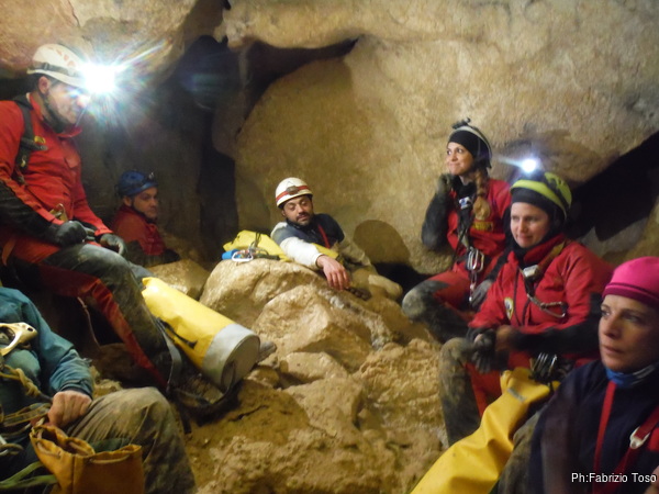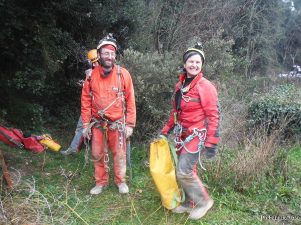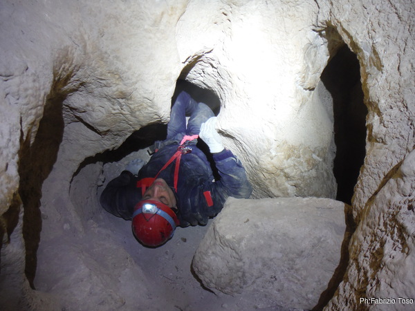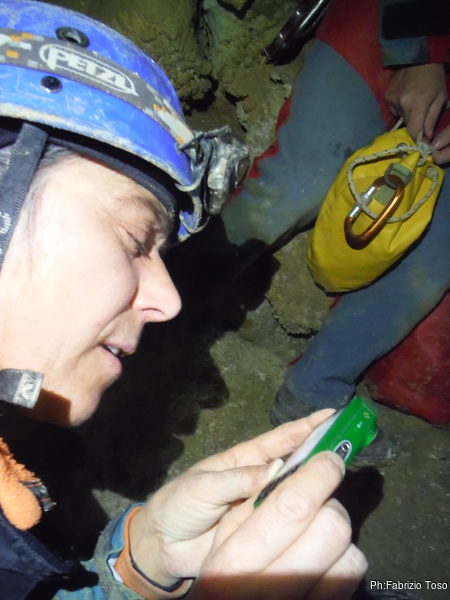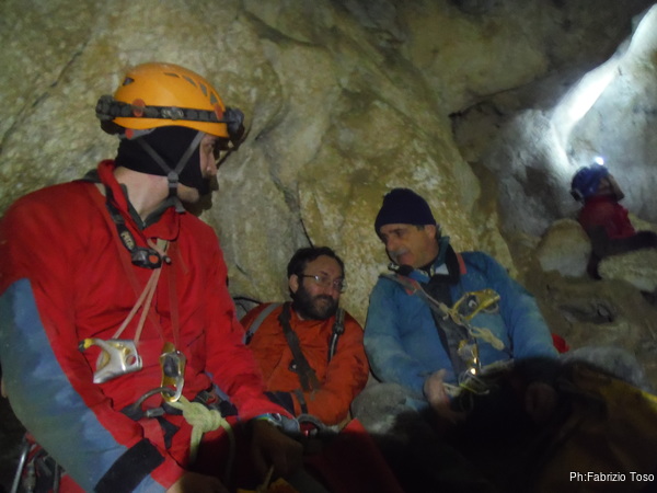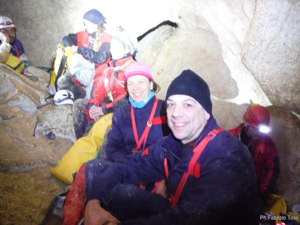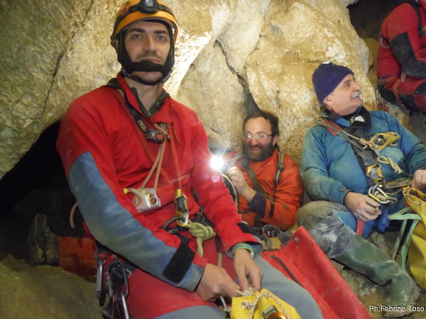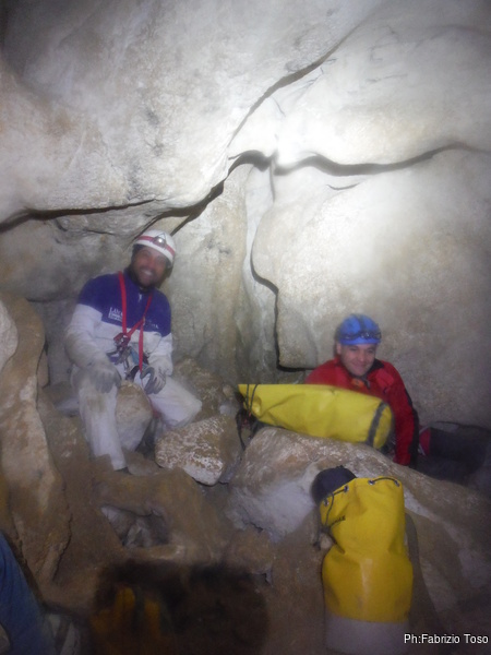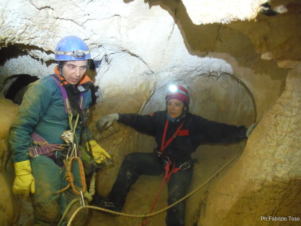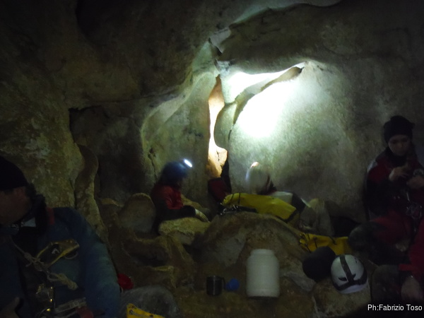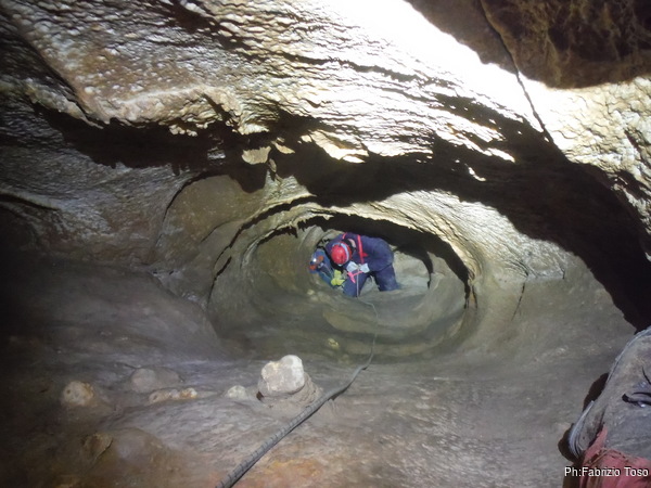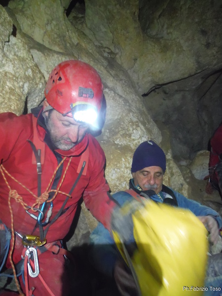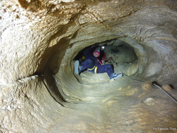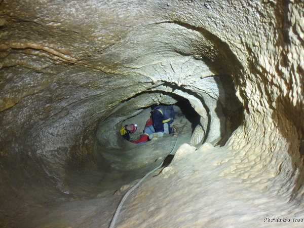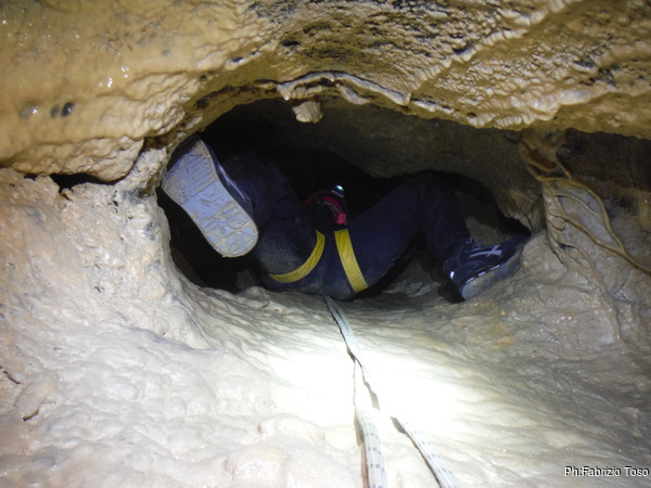 Dopo il primo toboga chiedo a Giuseppe di recuperare la corda e poi vado di nuovo avanti. Al secondo toboga trovo l’armo gia’ sistemato a regola d’arte da Simone e Chiara. Ci trovo anche la corda da 50m che useremo per la calata, e poi al ritorno per un eventuale contrappeso. Sistemo tutto, avviso Giuseppe che mi raggiunga e poi scendo lasciandogli il comando delle operazioni di calata. Pochi minuti e Marco fa la sua comparsa.