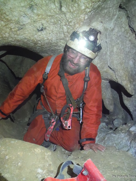 Carlo, con la sua tuta bianca ed immacolata. E’ amico di Marco ed e’ gia’ stato in grotta in passato ma riprende oggi dopo parecchio tempo.