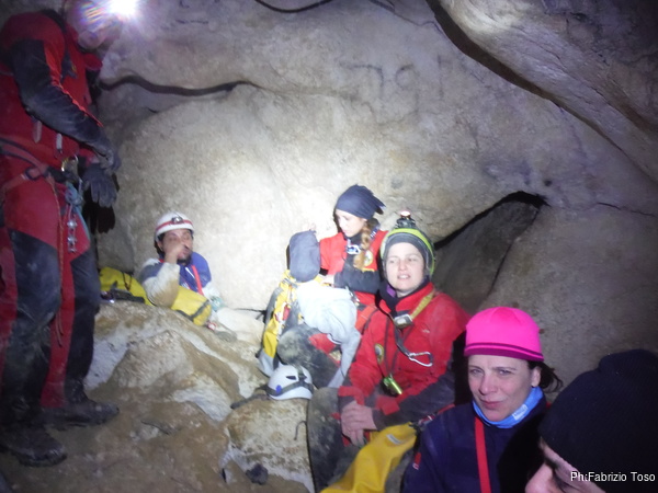 Melina e’ talmente veloce a scendere che non faccio a tempo a riprenderla. Quando il nostro gruppetto e’ radunato alla base del secondo toboga, riprendiamo il cammino. Poco piu’ avanti incontriamo Anna e Fabrizio che sono indecisi sulla strada da prendere. Indico loro la retta via e poi li seguiamo. Mentre camminiamo cerco di svolgere il mio ruolo di cicerone e descrivo alcuni punti della grotta. Arriviamo al passaggio esposto, usiamo la corda ma solo per fare una sicura a mano. Oramai Melina e Marco si muovono con discreta sicurezza. Dopo il passaggio faccio una breve sosta per una foto a Giuseppe, se l’e’ proprio meritata.