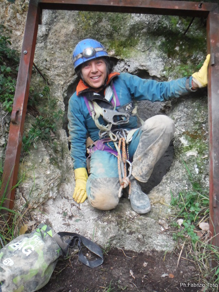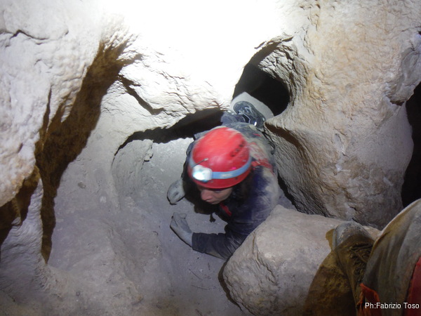 Il diavolo ci mette lo zampino. Scatto la foto ai miei amici poi sul visore della fotocamera compare la fatidica scritta “MEMORIA PIENA”…Qualche maledizione la lancio ma poi mi rassegno ed inizio a cancellare le foto piu’ vecchie. Ne cancello una decina. Devo fermarmi quasi subito perche’ la fotocamera inizia a mostrarmi porzioni di foto che poi non mi permette di cancellare. Riprovo piu’ volte togliendo e rimettendo la batteria per sbloccarla. Nulla da fare, la tristissima conclusione e’ che la scheda di memoria si e’ danneggiata. Spengo la fotocamera e decido di portarla comunque in grotta, centellinando le foto. Per primi entrano Chiara e Simone, andranno avanti al secondo toboga a sistemare l’armo, lo ricordo un poco sofferente. Con Melina e Marco entriamo come gruppetto centrale. I primi saltini e passaggi stretti non sono un problema. L’ultimo passaggio stretto prima del pozzetto li perplime perche’ sembra troppo stretto. Quando pero’ vedono tutti infilarsi e passare senza problemi si convincono che la cosa e’ fattibile. Per arrivare al pozzetto sperimentano anche il cunicolo in discesa ed ancora una volta se la cavano senza problemi. Per scendere il pozzetto e’ deciso che Melina e Marco li caleremo. Faccio loro un veloce spiegone circa il salvifico utilizzo delle longe, mi impossesso del discensore di Giuseppe e lo sistemo sull’armo. Con l’aiuto di Giuseppe, promosso sul campo come aiutante per l’operazione “calata”, recupero la corda di calata che ho nello zaino. E’ una corda da 20m e la porteremo avanti per usarla come corda di servizio per i passaggi piu’ impervi. Monto anche la corda nel discensore, pero’ la monto al contrario. Scendo alla base del pozzetto lasciando al prode Giuseppe il compito di sistemare tutto per benino.