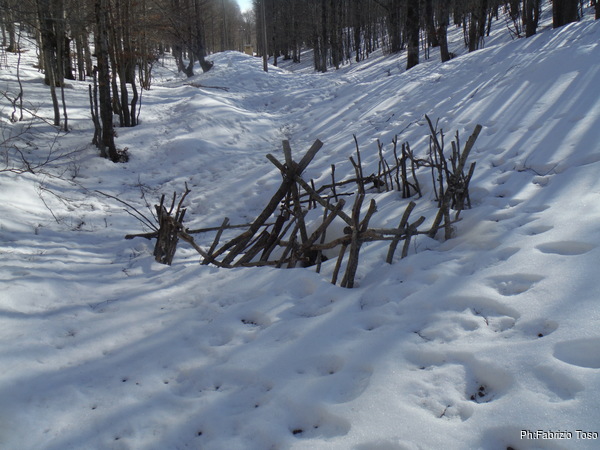 Mi avvicino con curiosita’. Dello steccato sembra rimasto ben poco, e’ quasi completamente sommerso dalla neve.