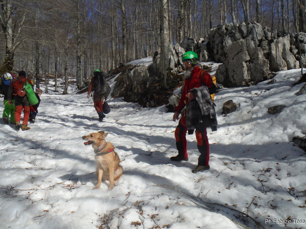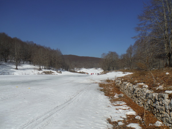 Ritorno al piazzale. Ora c’e’ qualche macchina in piu’, ma non molte. Ignorando Luna che scalpita, mi preparo con calma cercando di dimenticare nulla. Porto acqua per me e Luna, le ciaspole e, per esagerare, inzeppo nello zaino una sedia da campeggio. Come deciso, dopo la passeggiata ricognitiva, mi fermero’ nei pressi della grotta Doppio Rum a salutare i miei amici e a vederli entrare. La sedia potrebbe tornare utile. Zaino pronto, Luna prontissima, si parte. Prendiamo per la piana dove e’ tracciata la pista da sci di fondo. Come sempre, non faccio a tempo a fare il primo passo che alle mie spalle arriva la raccomandazione: “Non calpestare la pista da fondo!”. Proseguo senza voltarmi ma rispondo con un “certamente” che pare tranquillizzare i guardiapista. Per i primi metri devo tenere Luna ben vicina perche’ e’ eccitatissima e saltella a destra e sinistra come un canguro.