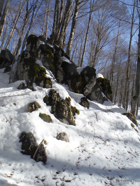 Ci addentriamo in una zona poco frequentata dai fondisti. Finora ho camminato senza troppi problemi ma ora inizio ad affondare nella neve fino al ginocchio. I miei pantaloni di pile sono allegramente pieni di palline di ghiaccio, in compenso ora sudo copiosamente. Faccio sosta. Mi tolgo la giacca di pile ed indosso le ghette, che tengo nella sacca delle ciaspole. Visto che ci sono, bevo un goccio d’acqua e ne offro un po’ anche a Luna, non sembra interessata. Siamo in una zona con tante piccole alture, dei montarozzi, direi. Ricordando dove si apre l’ingresso di Doppio Rum, decido di dar loro un’occhiata.