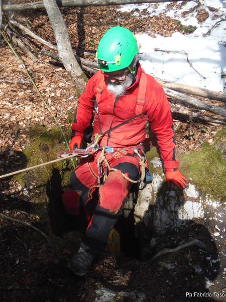 Le operazioni di sistemazione dell’armo prendono parecchio tempo. Inganniamo l’attesa con chiacchiere varie su temi speleo.