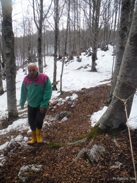 Purtroppo la mano continua a darmi fastidio, anche questo fine settimana dovro’ accontentarmi di fare ricognizione. Luna e’ contentissima di questa situazione e gia’ da casa inizia ad ululare dalla felicita’ quando prendo lo zaino e le faccio segno di seguirmi. Strada facendo ci fermiamo come al solito a fare colazione da Cicchetti. Mentre attacco con decisione il caffellatte arrivano Barbara e Fabrizio, anche loro con intenzioni bellicose. Ci scambiamo saluti e ci diamo appuntamento davanti alla grotta Doppio Rum, oggi andranno a tentare il passaggio di una strettoia. Finita la colazione, riparto. Non mi fermo all’appuntamento con il resto del gruppo, vado direttamente su a Livata, dove faccio sosta per prendere un poco di cibarie. Arrivo al piazzale di Campo dell’Osso con largo anticipo quindi proseguo dritto per andare a dare uno sguardo a grotta Vale, fosse mai ci siano novita’. Parcheggio a bordo strada, lo spiazzo dove di solito fermiamo le macchine e’ pieno di neve, uno strato compatto di almeno 60cm. Mi allontano dalla macchina in direzione della grotta, faccio fatica a distinguere i luoghi, la neve ha modificato tutti i miei punti di riferimento. In compenso pero’ la neve e’ molto compatta e posso camminare facilmente anche senza ciaspole. Imbocco il canale giusto e dopo alcuni metri inizio a vedere le tracce dello steccato che abbiamo eretto a protezione dell’ingresso.