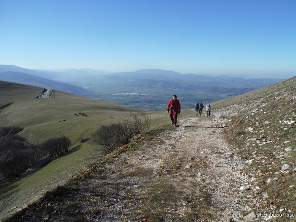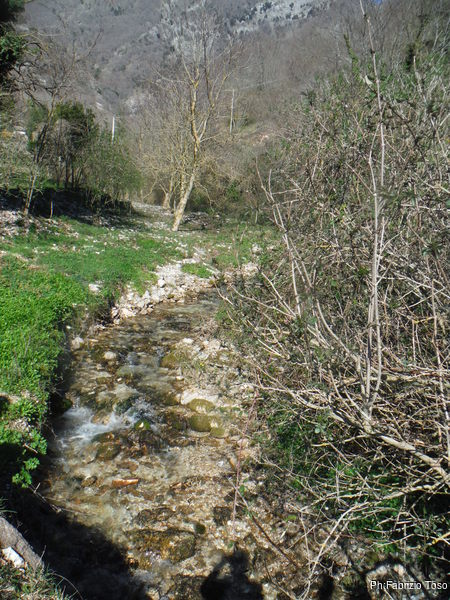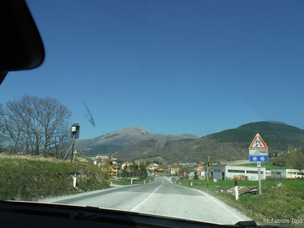 Appena fuori l’ostello c’e’ una strada che a destra attraversa un piccolo centro abitato, siamo a Villa Scirca, e poi sembra andare verso una valle dall’aspetto simpatico, in fondo si intravede una costruzione, una captazione, forse.