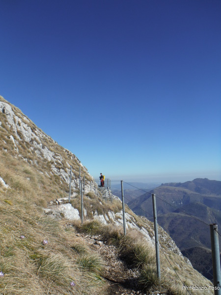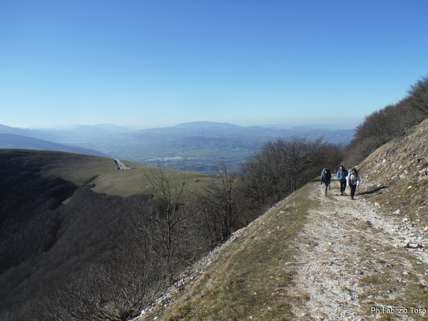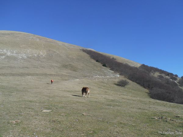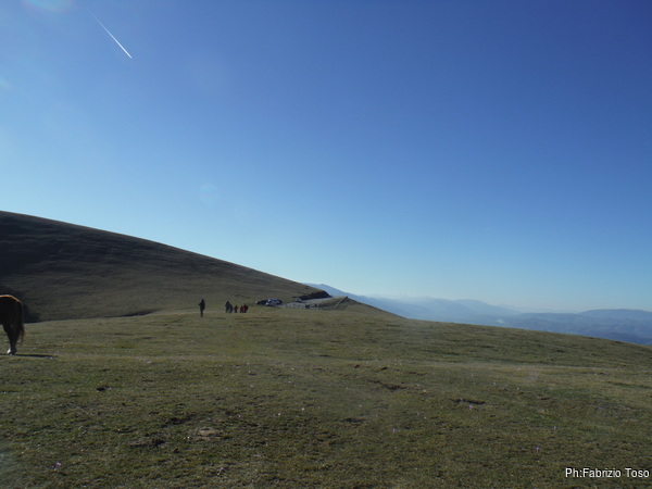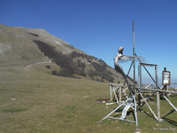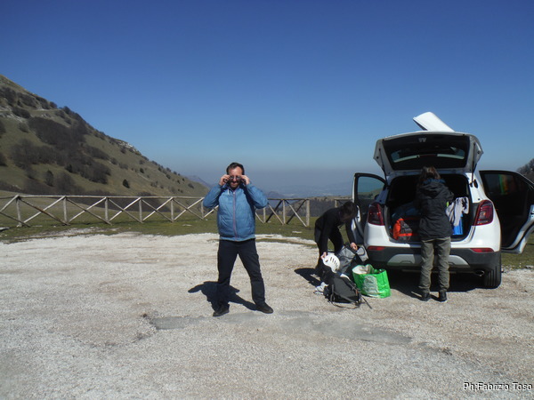 C’e’ un bellissimo sole ma non si riesce a goderne il tepore perche’ c’e’ anche un vento gelido e teso. Decidiamo di cercare un posto piu’ riparato per pranzare. Prima pero’ costringo i miei amici a subire le mie chiacchiere su quel che vedono tutto intorno. Approfitto biecamente del fatto che per tutti loro e’ la prima visita. Io invece posso vantare qualche esperienza in piu’ ed intendo sicuramente farne mostra. Per prima cosa mostro loro il pratone dove i deltaplani solitamente decollano. Oggi e’ desolatamente vuoto, quindi non li impressiona piu’ di tanto. Passo poi ad indicare il sentiero che porta alla grotta, quello che percorreremo domani.