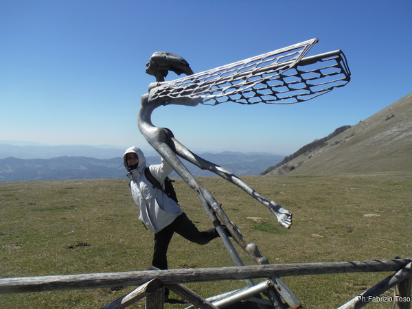 Prima di andare facciamo un rapido saluto alla signorina con le ali. Il vento ha presto raffreddato le mie smanie divulgatorie. Saliamo di nuovo in macchina per andare a cercare posti piu’ accoglienti.