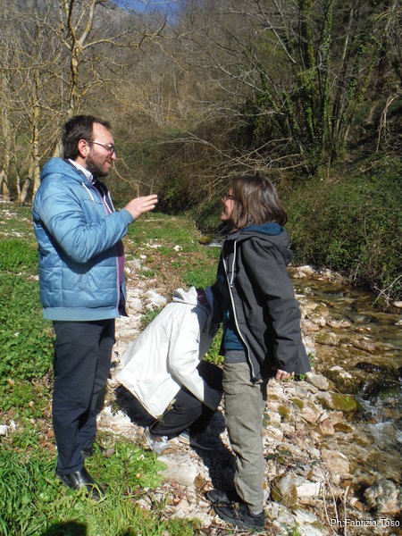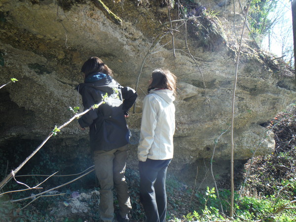 Andiamo. Dopo il centro abitato seguiamo una strada che costeggia un torrentello. Le pareti alla nostra destra sono di breccia conglomerata (i geologi perdonino la terminologia approssimativa!), Angelica e Valentina se le studiano con attenzione.
