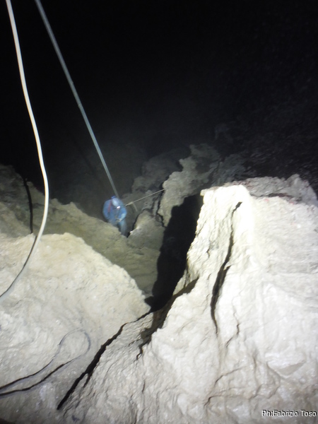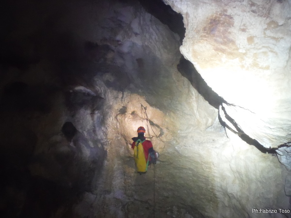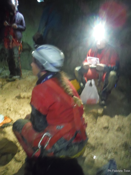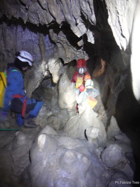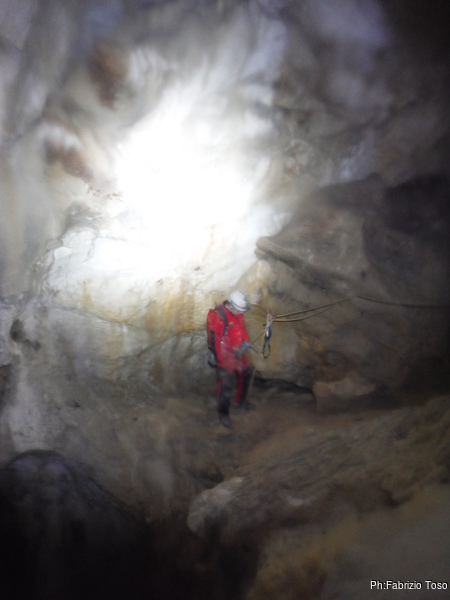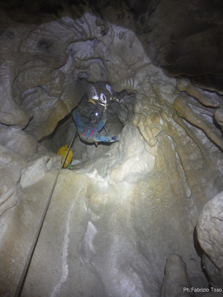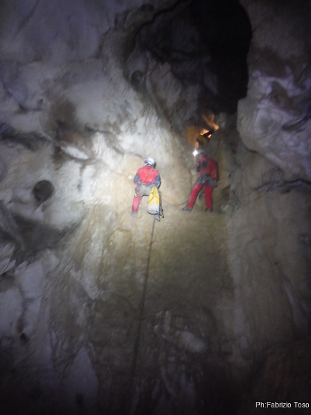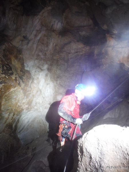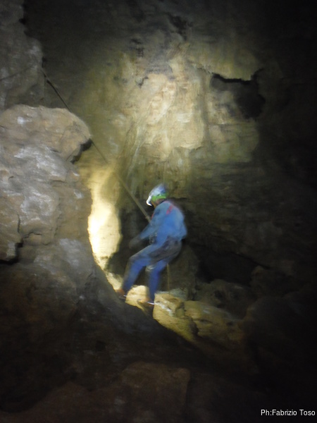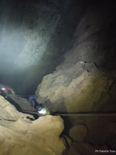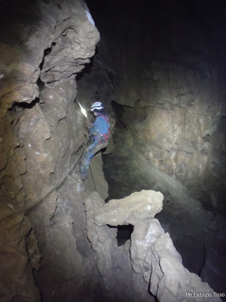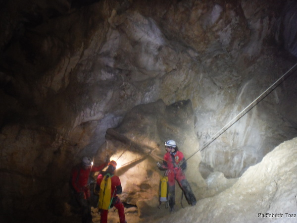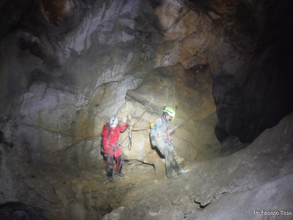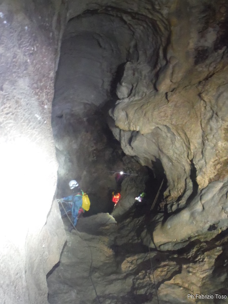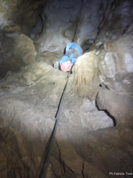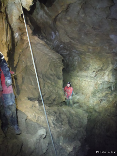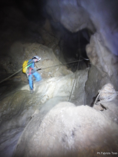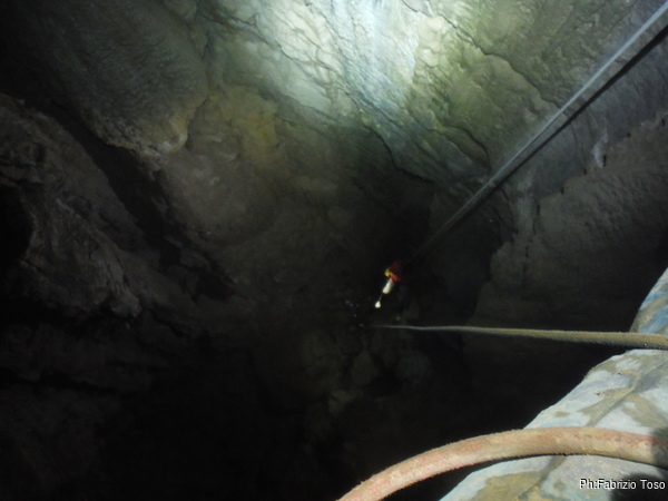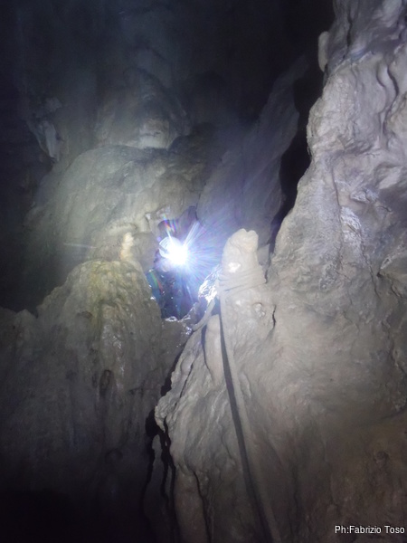 Arrivati alla base del Baratro, mi fermo per sbrigare un bisogno impellente. Nel frattempo sento Giuseppe che prosegue la discesa. Alcuni hanno deciso di fermarsi qua. Pero’ anche la volta scorsa sono arrivato “solo” in fondo al Baratro. Sapere cosa c’e’ dopo e non andare a dare una sbirciata sinceramente mi scoccia, farlo per 2 volte di seguito mi sembra una esagerazione. Cerco volontari per seguire Giuseppe. Ne trovo una in Valentina. Iniziamo a scendere.