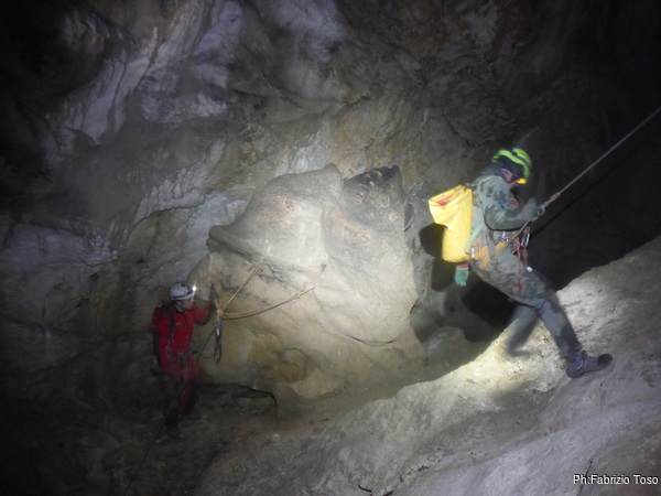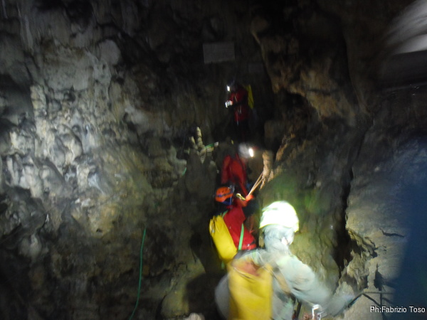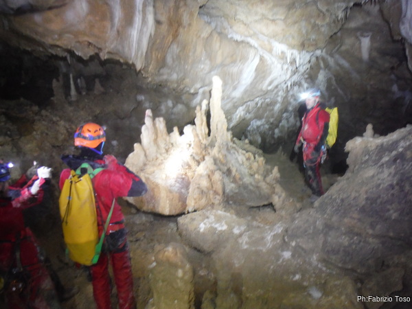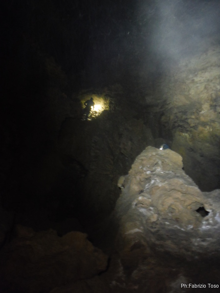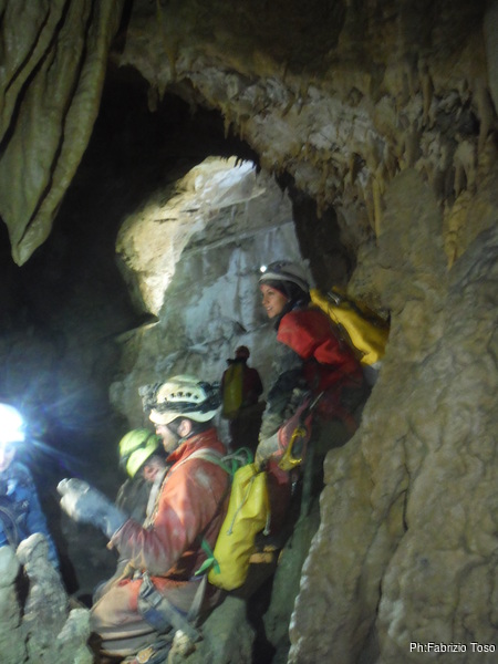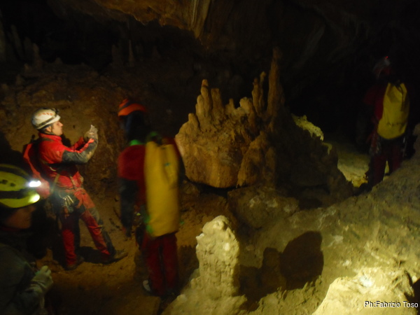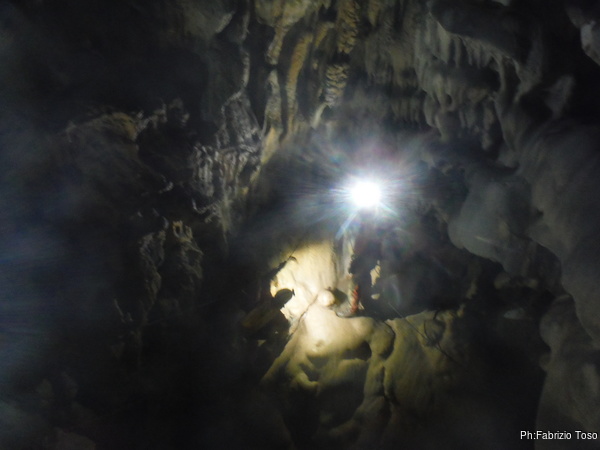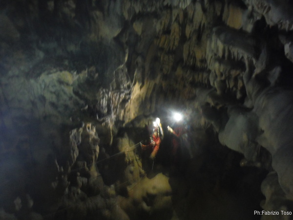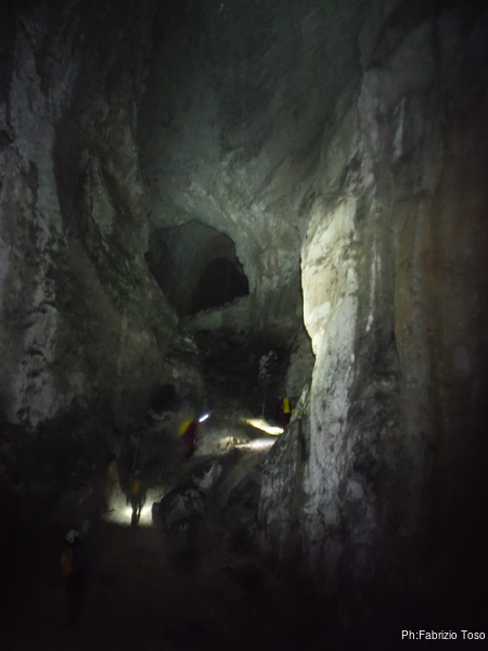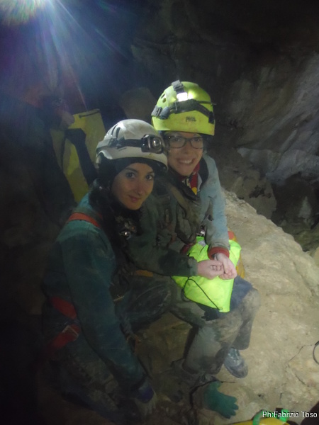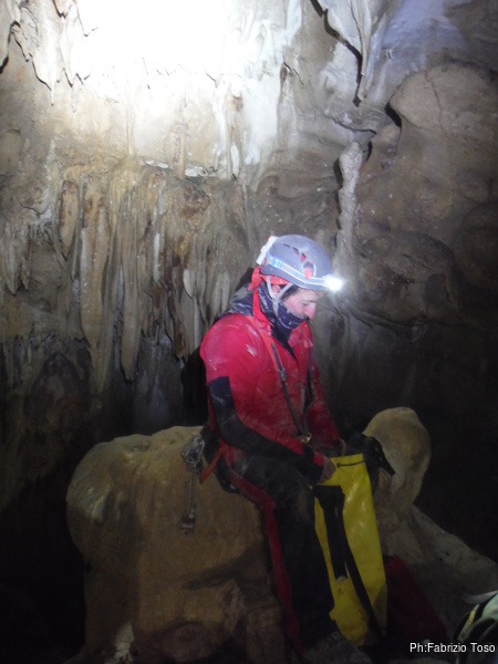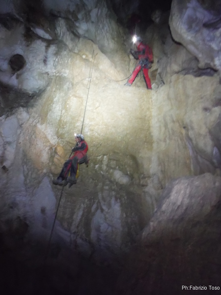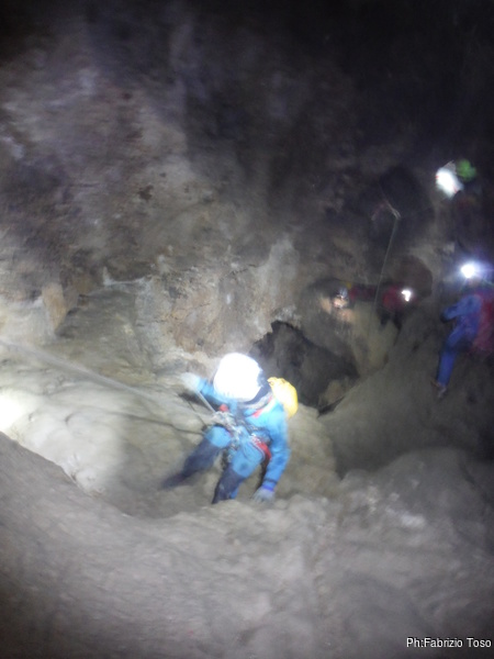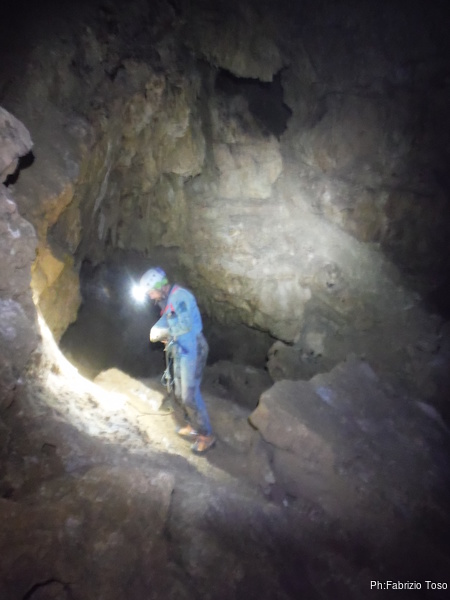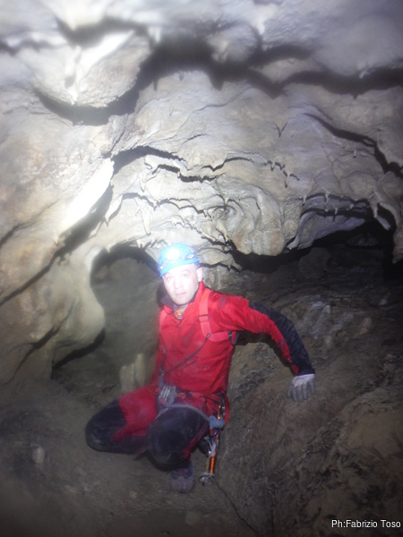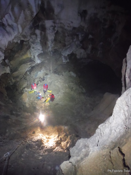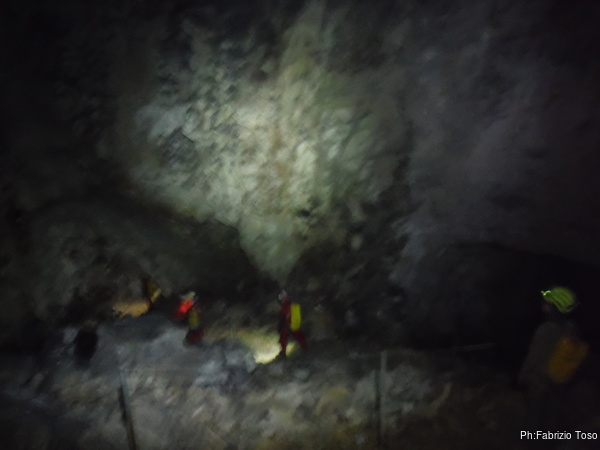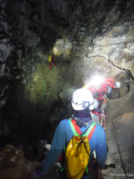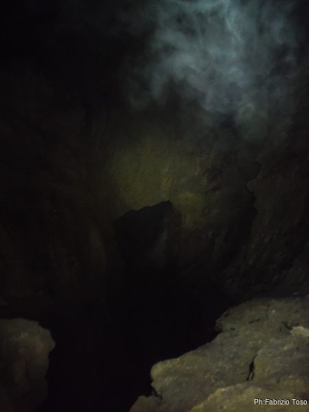 Arrivati alla base del Baratro, mi fermo per sbrigare un bisogno impellente. Nel frattempo sento Giuseppe che prosegue la discesa. Alcuni hanno deciso di fermarsi qua. Pero’ anche la volta scorsa sono arrivato “solo” in fondo al Baratro. Sapere cosa c’e’ dopo e non andare a dare una sbirciata sinceramente mi scoccia, farlo per 2 volte di seguito mi sembra una esagerazione. Cerco volontari per seguire Giuseppe. Ne trovo una in Valentina. Iniziamo a scendere.