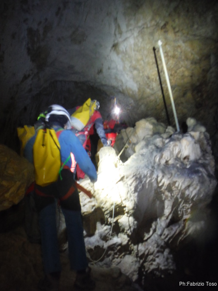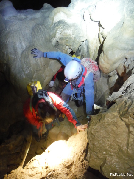 Si sale di nuovo, ma stavolta per una giusta causa, siamo arrivati alla deviazione che ci portera’ alle zone verticali della grotta.