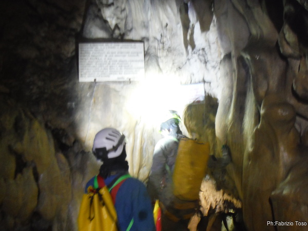 All’ingresso del meandrino ci sono delle targhe,la piu’ grande c’e’ da quando ho conosciuto la grotta e non ricordo piu’ cosa commemori. Alla piu’ piccolina mi soffermo un attimo per rivolgere un pensiero al ragazzo che ha lasciato la vita in questa grotta. Partecipai al suo recupero negli ultimi anni della mia esperienza nel soccorso e ancora dopo tanti anni sento una punta di tristezza.