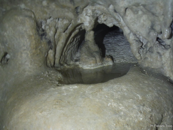 Saliamo sulla destra lungo la parete di un gigantesco imbuto che porta ad un meandrino con pozze d’acqua alla base che a sua volta sbuca al pozzo Terni.
