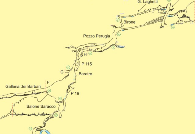 Proseguiamo. Per aiutarmi nel descrivere il giro che faremo, ho estratto un pezzo del rilievo dal sito del CENS. Praticamente dalla sala Margherita, in alto a destra arriveremo al pozzo Terni scendendolo fino al meandro che porta al pozzo Perugia. Poi andremo al Baratro, il salone Saracco prendendo da qua la via del ritorno. Al ritorno, tanto per variare, arrivati in cima al pozzo Perugia continueremo a salire per il Birone per poi affrontare la galleria Laghetti fino a far ritorno al pozzo Terni e quindi alla sala Margherita.