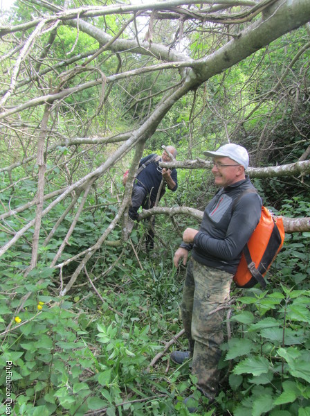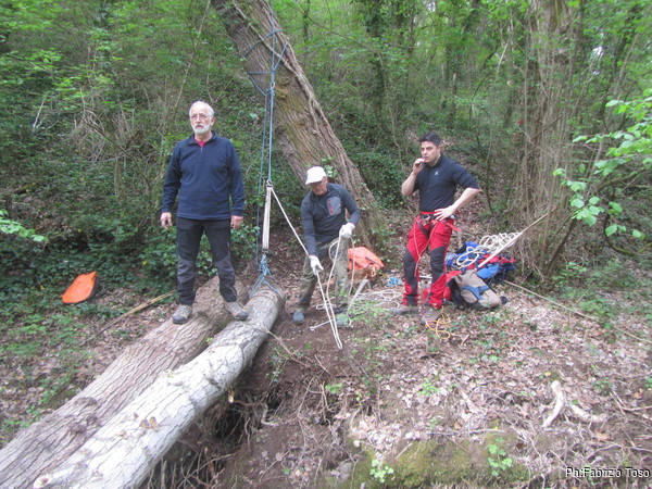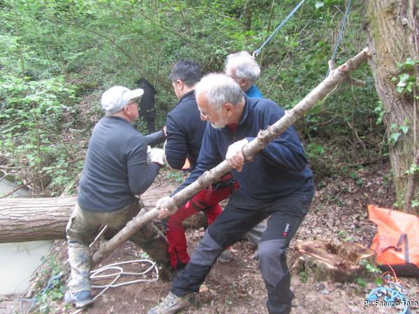 La mattina dopo, Betta ed io ci rechiamo al Food Village per la colazione. Ci incontriamo la’ con Simone, Silvano e Stefano, questi ultimi del CAI di Terni. Simone ci informa che Piergiorgio, ci aspetta in loco, al ponte. Piergiorgio e’ membro della sottosezione CAI di Orvieto e si e’ preso l’incarico di fare il nuovo sentiero. Un lavoro immane che porta avanti con passione chiedendo una mano quando e’ proprio indispensabile. Tempo fa, con altri amici, stavano sistemando 2 tronchi tra le sponde di un torrentello per fare un ponte. Purtroppo uno dei 2 tronchi e’ scivolato giu’ e non sono riusciti a recuperarlo con i mezzi a disposizione. Oggi tocchera’ a noi fare un altro tentativo. Arrivare al ponte non e’ semplicissimo, il sentiero e’ ancora in allestimento. Nonostante qualche giro a vuoto alla fine ci arriviamo. Subito dopo i saluti con Piergiorgio, diamo inizio ai lavori. Simone monta un paranco “speleo” da un lato del tronco per poterlo spostare parallelamente al terreno di quel poco che serve per disincastrarlo. Silvano e Stefano hanno portato una coppia di carrucole a 4 “vie” che dovrebbe permettere di sollevare il tronco dall’altro lato. Eccoci ognuno al proprio posto, Simone e Piergiorgio per lo spostamento, Silvano e Stefano per il sollevamento…ed io a far foto!