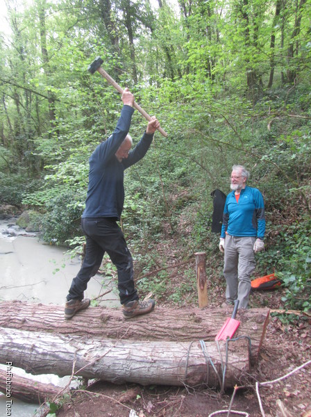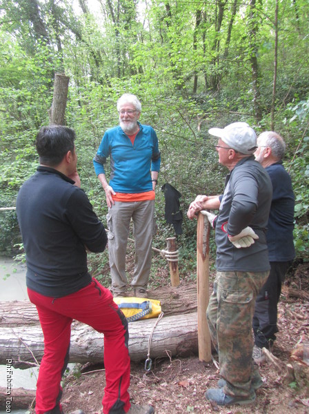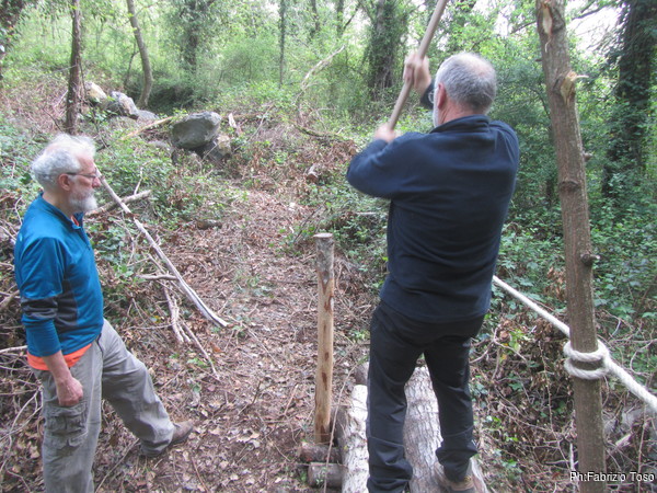 Piergiorgio recupera alcuni pali appuntiti e Silvano si occupa di piantarli per fare da fermo ai tronchi ed una sorta di parapetto al ponte.