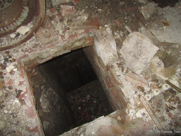 Simone ci porta vicino ad una botola e ci racconta di quando con Filippo hanno provato ad esplorare la condotta sotterranea, probabilmente quella di deflusso dell’acqua. Al momento si pensa che purtroppo l’estremita’ a valle sia ostruita perche’ dopo alcuni metri di condotta ci si ritrova sommersi da acqua e fango.