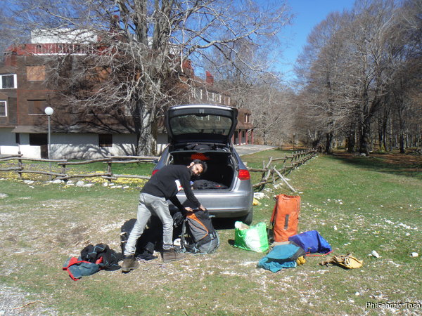 Arriviamo al “campo” dell’attuale fondo. Matteo si toglie tutto l’imbrago e va subito a vedere lo stato dell’arte in zona lavori. Io faccio la stessa cosa ma con piu’ calma.