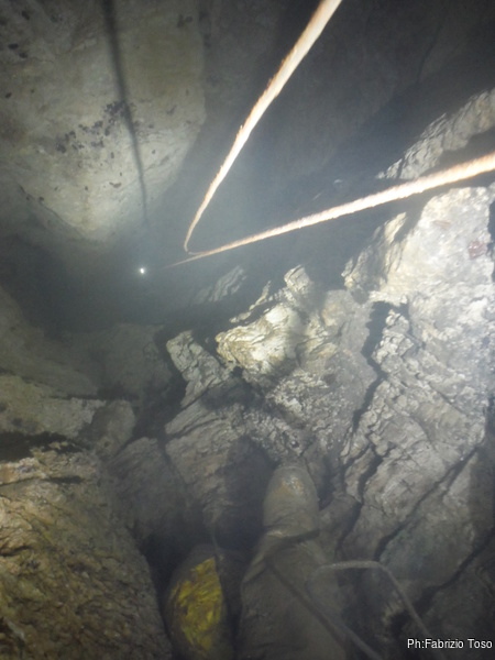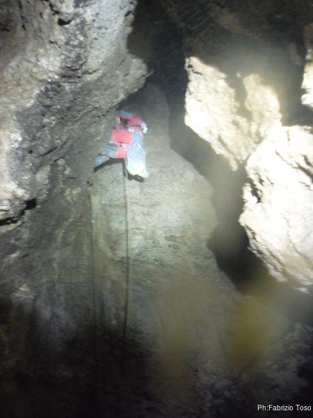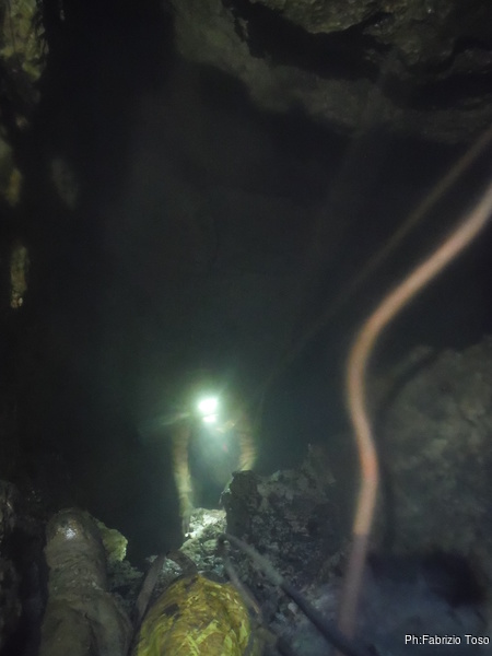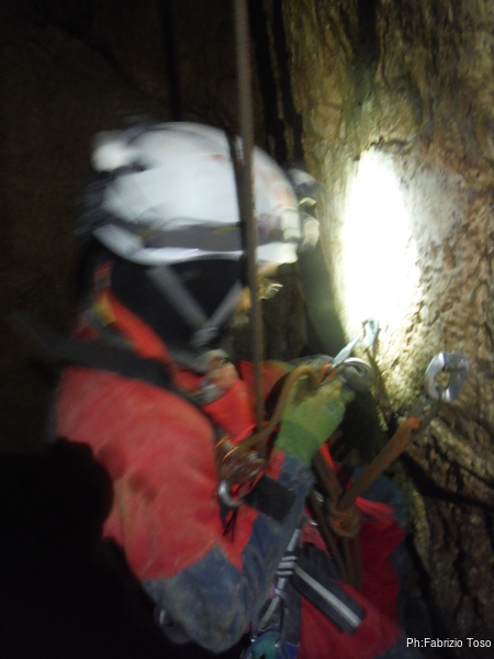 Per il tratto successivo di grotta mando avanti lui, cosi’ si puo’ godere la scoperta della grotta. All’ultimo pozzo facciamo una rapida sosta per sistemare finalmente il deviatore che manca. Abbiamo appositamente preso dal magazzino un cordino ed un moschettone. Pochi minuti ed e’ a posto.