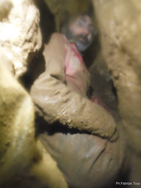 Una panoramica della prima curva dopo il lavoro fatto. Matteo per ricavare altro spazio dopo la curva decide di buttare giu’ parte del fango che c’e’ sulla parete. Riesce nell’intento di ricavarsi spazio, pero’ con il fango ostruisce la via di deflusso dell’acqua ed in breve si ritrova con le scarpe completamente sommerse da fango acquoso.