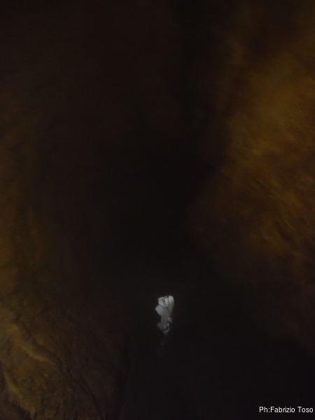 Alla fine, anche se la situazione migliora, il fango ha la meglio sulla tenacia di Matteo. Quando lo vedo tremare come una foglia e’ facile decidere che e’ l’ora di tornare indietro. Rifacciamo gli zaini, indossiamo di nuovo gli imbraghi ed iniziamo la salita. Vado avanti io. Ci teniamo ad un frazionamento di distanza. Riesco a beccarlo con un sasso, pero’ piccolo, solo una volta. Vista la mala parata Matteo rallenta la sua andatura ed in breve ci perdiamo di vista. Arrivo al primo pozzo, al terrazzino fangoso, li’ dove ci sono 2 vie per risalire. Mi fermo ad aspettare il mio amico per salire assieme. Stavolta mi sistemo sulla corda con i frazionamenti, cosi’ puo’ godersi la tirata unica.