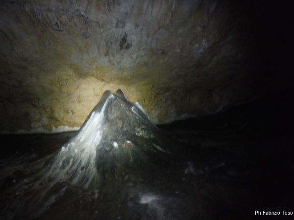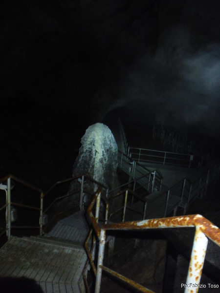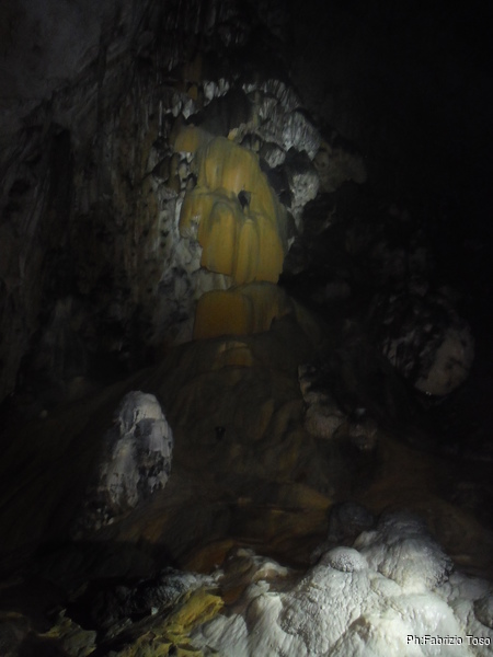 Siamo quasi alla enorme stalagmite che segna praticamente l’inizio della seconda sala. Vista da lontano sembra avere la sommita’ innevata.