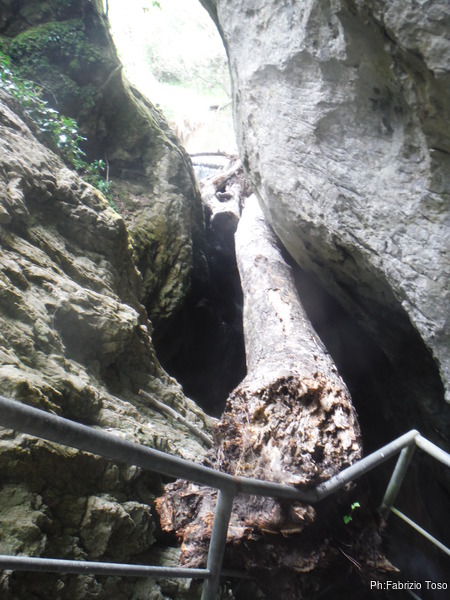 All’ingresso dell’Ovido, vedo Luna esitare, qua le scale hanno una grata metallica con la trama piu’ larga delle sue zampe e quindi fa fatica. Pero’ quando mi vede avanzare viene anche lei, pur lanciandomi una occhiata esasperata. Dopo la prima rampa c’e’ ancora il tronco portato dalla corrente un paio d’anni fa.