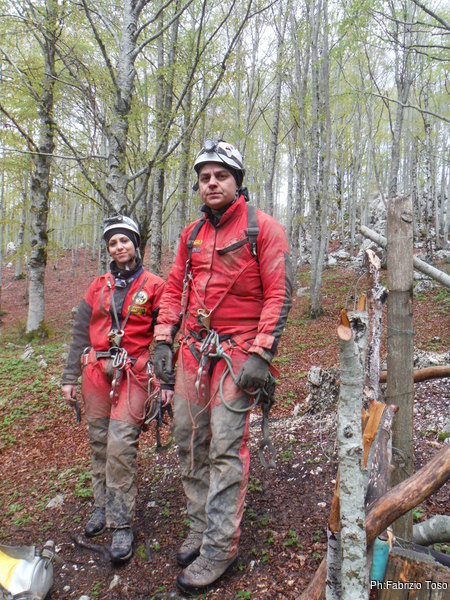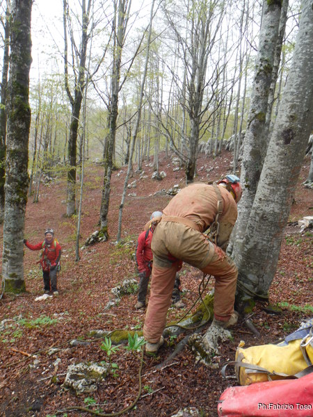 Facciamo il piano di massima per la giornata. Fabio e Valerio entreranno per primi ed andranno al fondo per proseguire i lavori. Io li seguiro’ dopo aver fatto il primo pozzo insieme al quartetto dei miei amici orvietici. Prima che Valerio parta mi raccomando con lui: “Prendi lo zappetto alla base del primo pozzo, ti sara’ utile per drenare l’acqua in fondo, dove lavorerete”. Mi fa un cenno di assenso e scompare velocemente giu’. In un paio di minuti anche Fabio parte.