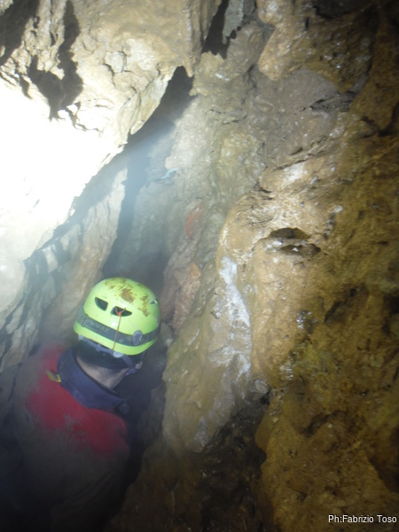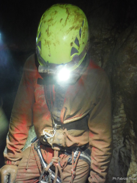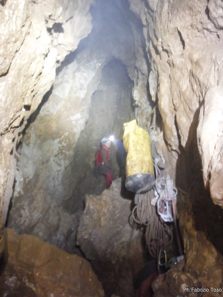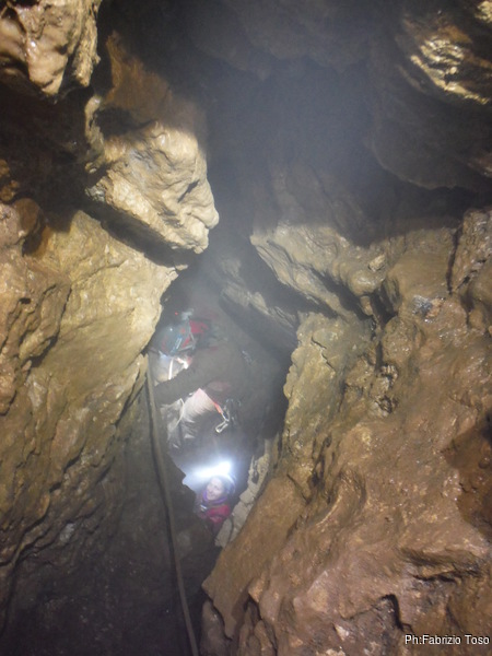 Passiamo un paio d’ore circa lavorando di buona lena, sempre nella stessa configurazione, Valerio avanti, Fabio in prima linea ed io nelle retrovie. I miei amici sopra sono arrivati in zona, la partenza dell’ultimo pozzo, da un po’, ne avverto i rumori. Ad un certo punto sento chiamare dall’alto. Salgo fino alla base del pozzo per sentire. E’ Simone, mi avverte che secondo loro la risalita e’ inutile farla, e non la faranno. Oltre a questo, Chiara ha iniziato a sentire mal di gola, tossisce e preferisce uscire. Simone la accompagnera’ fuori. Barbara e Giuseppe, lasciati soli ed inoperosi, decidono di scendere a farci visita. Aspetto che arrivino per far loro delle foto.