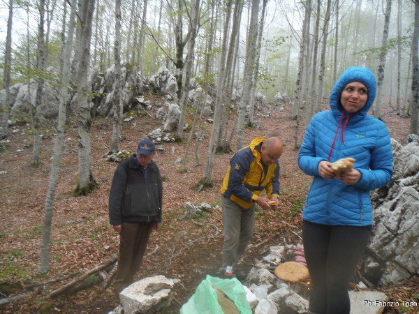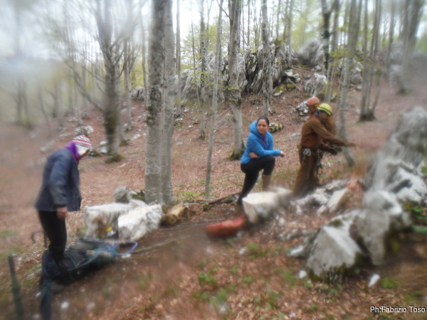 Fuori trovo Simone e Chiara che aspettano, sono andati alla macchina, si sono cambiati e poi son tornati qua. Valerio e Fabio invece sono ancora in tenuta fangosa. Proprio mentre metto la faccia fuori dalla grotta, dei loschi figuri si avvicinano dal sentiero. Ma sono Nerone, Elia ed Alfredo! Come promesso sono venuti a preparare un allegro spuntino caldo per chi e’ andato in grotta.
