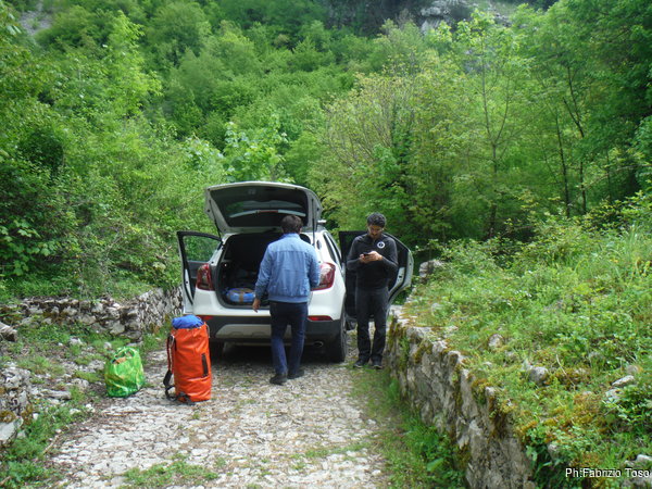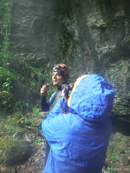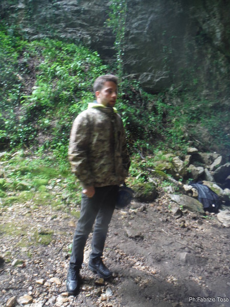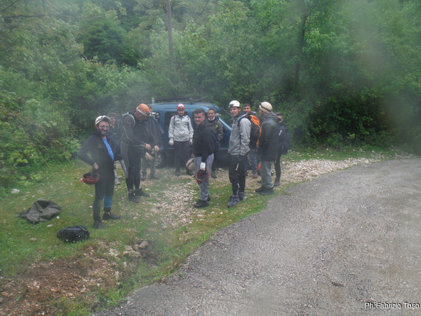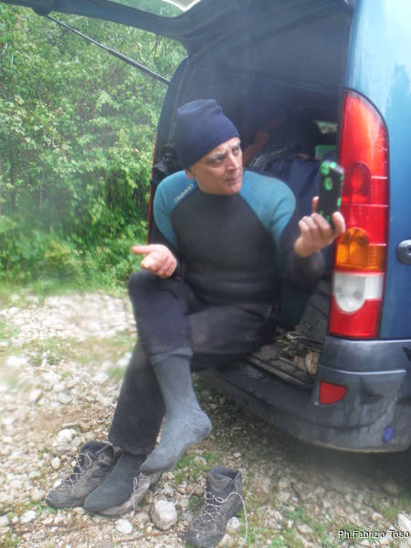 Durante il viaggio d’andata, prima e dopo adeguata sosta per la colazione, decidiamo il da farsi. Andremo all’Inferniglio anche la mattina, magari riusciremo a fare qualche foto migliore del solito. Arriviamo al parcheggio vicino all’Inferniglio. Troviamo subito un intoppo, Gabriele ha perso le chiavi del siluro che ha sopra la macchina. Per prima cosa cerchiamo di forzare la serratura ma non abbiamo attrezzi acconci, quindi lasciamo perdere. Per fortuna la sua muta ed il casco sono nel bagagliaio, gli mancano la luce e le scarpe. Per la luce provvedo io, ho portato una frontale in piu’ come faretto per le foto. Per le scarpe, Giuseppe rinuncia alle proprie da grotta mettendosi quelle da ginnastica. Appena risolti i problemi gabrielleschi, decidiamo di dare inizio alla vestizione, e naturalmente inizia a piovere.