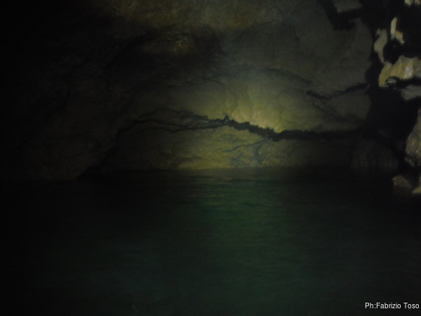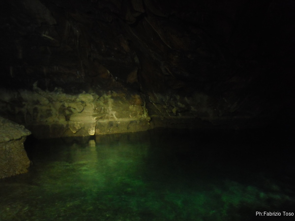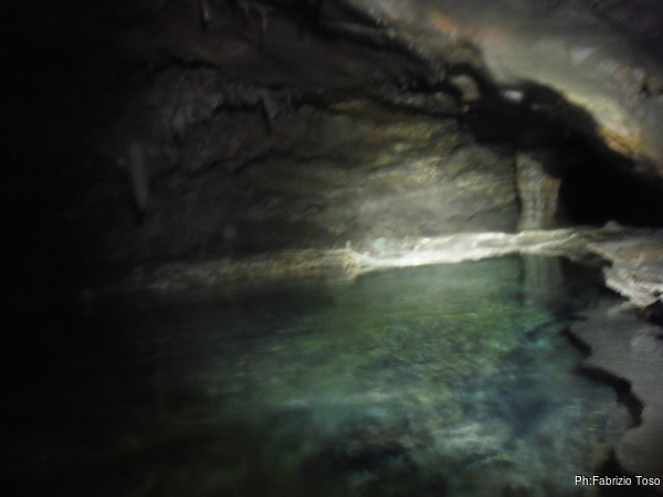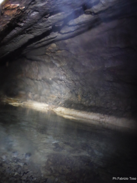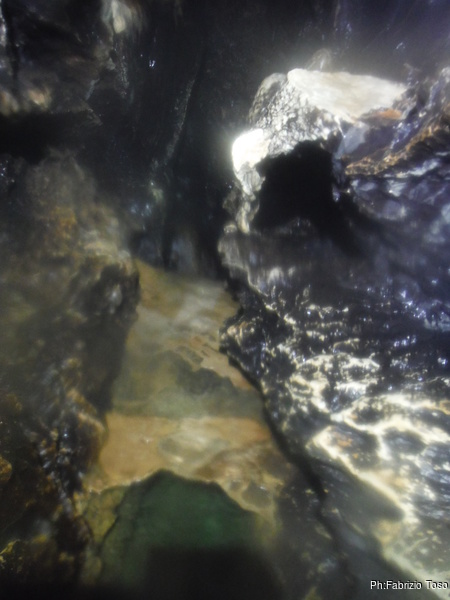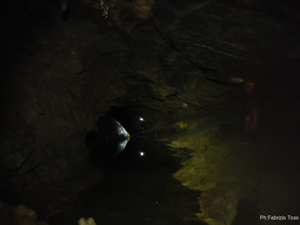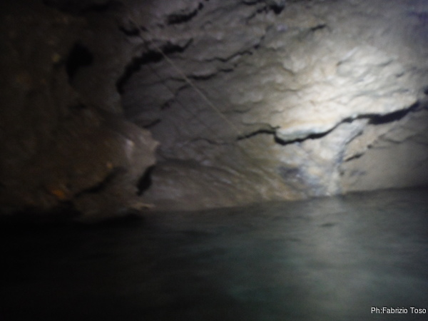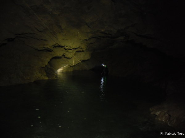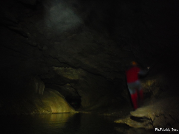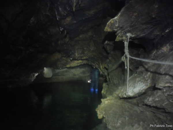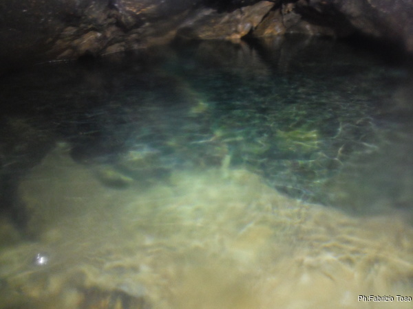 L’acqua al primo laghetto e’ alta, non in maniera preoccupante, ma abbastanza alta. Passando sulle tavole che fanno da passerella, ci si trova nell’acqua fin poco sotto il ginocchio. Io, con la muta completa passo senza problemi, lo stesso fa Gabriele.