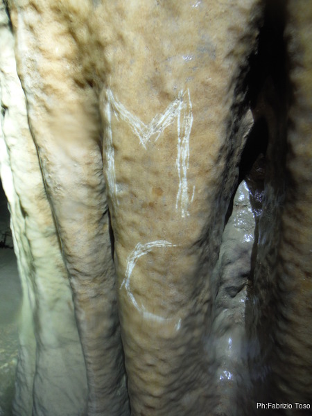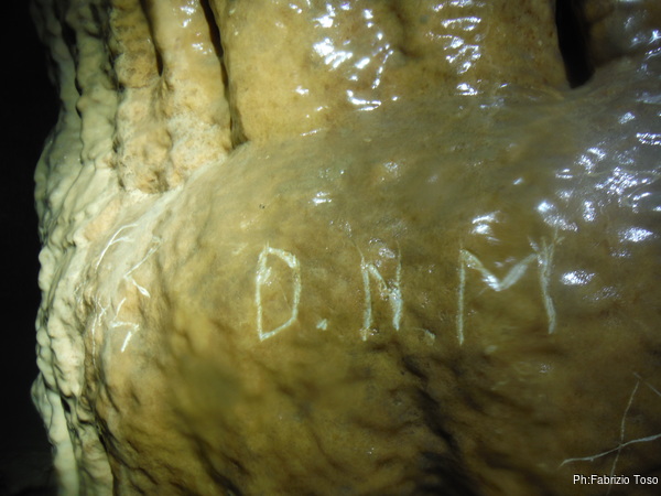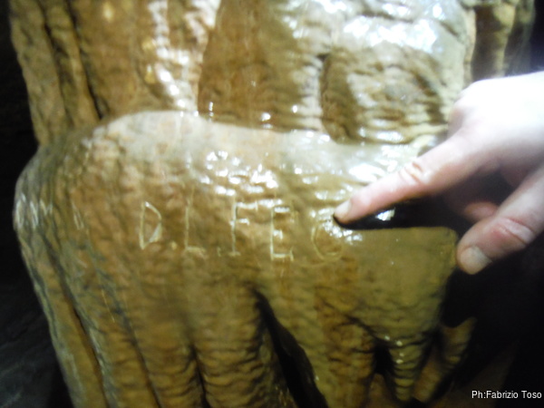 La sosta successiva e’ alla bella colonna che e’ stata rovinata da numerosi graffiti. Ne facciamo alcune foto per mostrare quello che in grotta non si deve fare. La mano di Gabriele e’ utile per le proporzioni.