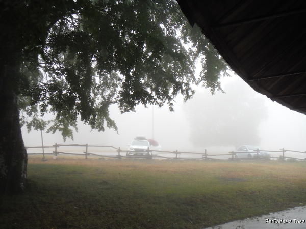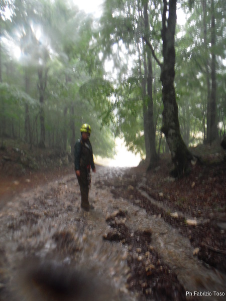 Prendiamo svelti le nostre cose e partiamo alla volta della macchina. La strada che scende di fianco alla grotta e’ un piccolo torrente. Oramai siamo talmente bagnati che nemmeno ci curiamo di coprirci. Arrivati quasi alle macchina mi accorgo di aver dimenticato l’ombrello sulla staccionata che protegge l’ingresso della grotta. Ci guardiamo in silenzio con Angelica poi torniamo indietro a prenderlo. Al secondo giro riusciamo finalmente a raggiungere la macchina. Giulio e’ dentro col riscaldamento acceso a recuperare il calore. Con il prezioso aiuto di Gabriele recuperiamo le nostre cose ed andiamo a cercare un angolo asciutto dove cambiarci. Nonostante la pioggia a vento cerchi di rompere le scatole, riusciamo a cambiarci in maniera decente. Contenti e quasi asciutti torniamo alla macchina.