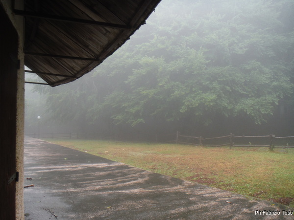 La tettoia ci protegge a malapena, piove a vento.