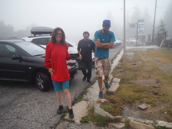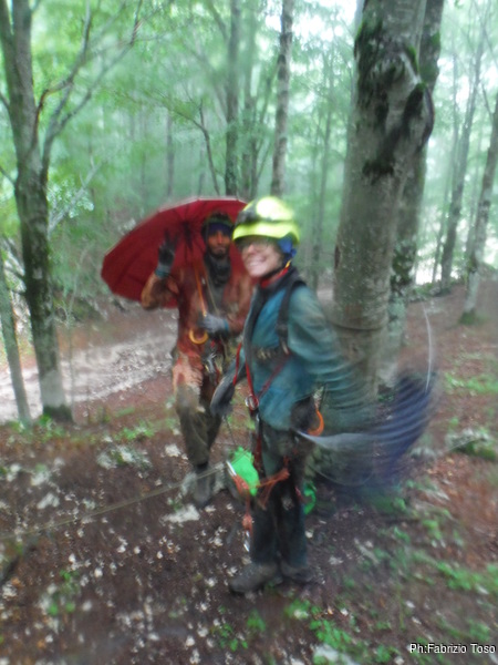 Finiamo di prepararci e siamo gia’ zuppi. Gabriele si impietosisce e viene lui a portarci lo zaino con il materiale.