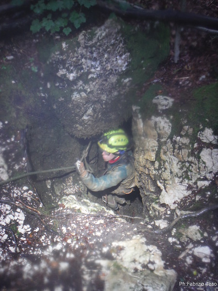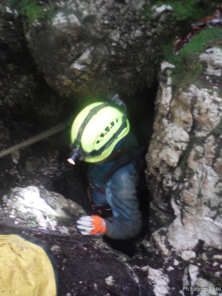 Entra per primo Giulio. Gli appioppo lo zaino col materiale. Aspettiamo un tempo congruo affinche’ possa scendere il primo pozzo senza ricevere sassi in testa. Angelica va avanti ed io chiudo la fila. Il primo pozzo ha 2 vie armate cosi’ scendiamo assieme.