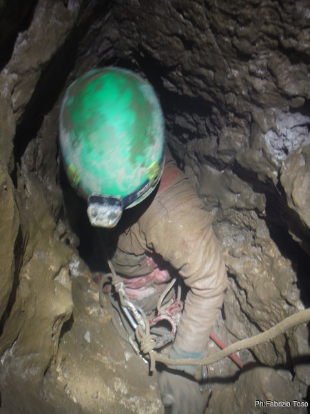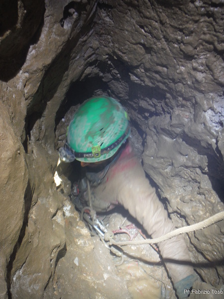 Finiamo di sgranocchiare della frutta secca poi Giulio riprende “spintaneamente” lo zaino con i materiali ed inizia a risalire. Angelica ed io attendiamo che Giulio passi la prima strettoia sopra di noi per partire. Una fredda attesa. Saliamo tenendoci a vista, ad un frazionamento di distanza. Io chiudo la fila e ne approfitto per ripulire il pozzo dai sassi in bilico.