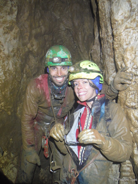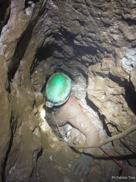 Con un sospiro di rassegnazione poso l’attrezzatura e mi faccio raccontare cosa vedono i miei amici. Mi parlano di un pozzo comodo di una decina di metri che termina in una sala. In fondo alla sala si vede buio. La loro versione coincide abbastanza con quella data da Valentina la volta scorsa. Non ho nemmeno il tempo di passar loro la fotocamera, l’acqua continua ad aumentare, la situazione potrebbe diventare spiacevole, meglio che tornino indietro. Per prima passa Angelica, il ritorno non e’ agevole nemmeno per lei, ci si deve lavorare ancora. Giulio infatti ci mette un poco a passare e nel farlo snocciola un buon numero di maledizioni. L’acqua continua ad aumentare. La strettoia, o meglio la ex-strettoia, ad “S” ora e’ allagata, quando siamo arrivati non c’era traccia d’acqua. Si, e’ proprio il caso di andare. Ecco i nostri esploratori poco prima di iniziare la risalita.