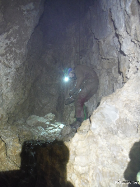 Della discesa non faccio foto, oramai e’ quasi un percorso di routine. Al fondo troviamo Giulio che gia’ smartella allegramente. Oggi c’e’ una notevole corrente d’aria, soffia da dentro verso l’esterno. Se possibile fa piu’ freddo del solito. E’ il freddo a decidere i tempi per scambiarci di posto in zona scavi. Angelica ed io aspettiamo che Giulio sfoghi il suo ardore sulla roccia poi ci organizziamo. Sistemiamo la corda di sicura ed Angelica passa sul terrazzino dopo la strettoia. Lei tanto ci passa larga. Una volta sistemata al sicuro, le passo mazzetta e scalpello e anche lei inizia a menare sulla roccia con convinzione. Uso il trapano per fare una miriade di fori per indebolire la roccia e poi spaccarla con mazzetta e scalpello. Facciamo spesso cambio con Giulio. Quando chi e’ fermo inizia a sentire freddo ci scambiamo nuovamente. Il lavoro procede bene, ora potrei anche provare a passare. C’e’ Giulio al lavoro adesso. Intanto preparo gli attacchi, verifico che il trapano abbia ancora un minimo di carica per piantare il paio di fix che abbiamo, recupero la chiave d’armo. Sono pronto per andare ad esplorare. Giulio nel frattempo ha fatto saltare dei bei pezzi di roccia, decide di tentare anche lui il passaggio.