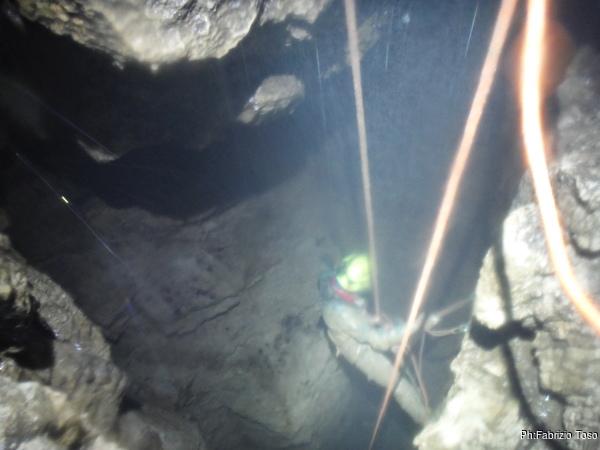 L’ultimo pozzo lo salgo insieme ad Angelica. Io sono sulla corda con meno frazionamenti. Purtroppo pero’ lui e’ anche sulla verticale del pozzo, nel punto in cui oggi cade piu’ acqua…e oggi ne cade proprio tanta.