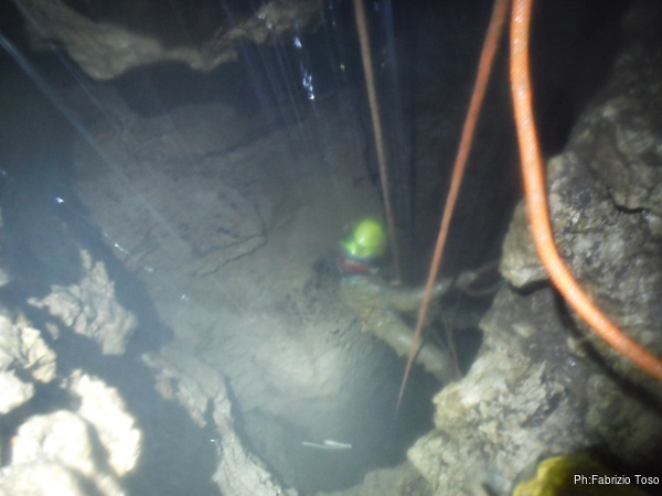 Ora e’ dall’altra parte. Ancora un minuto e l’acqua ora forma una piccola cascata che ostruisce parzialmente la strettoia. Credo che ancora una volta dovro’ rinunciare a vedere con i miei occhi cosa c’e’ dopo…