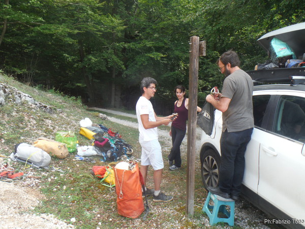 Quando abbiamo preso tutte le nostre cose dalla macchina, Gabriele ci annuncia che lui non ha voglia di venire in grotta oggi e vuole invece andare a fare un giro verso il Cavorso. Subito risolviamo portando tutto il necessario davanti l’imbocco della grotta.